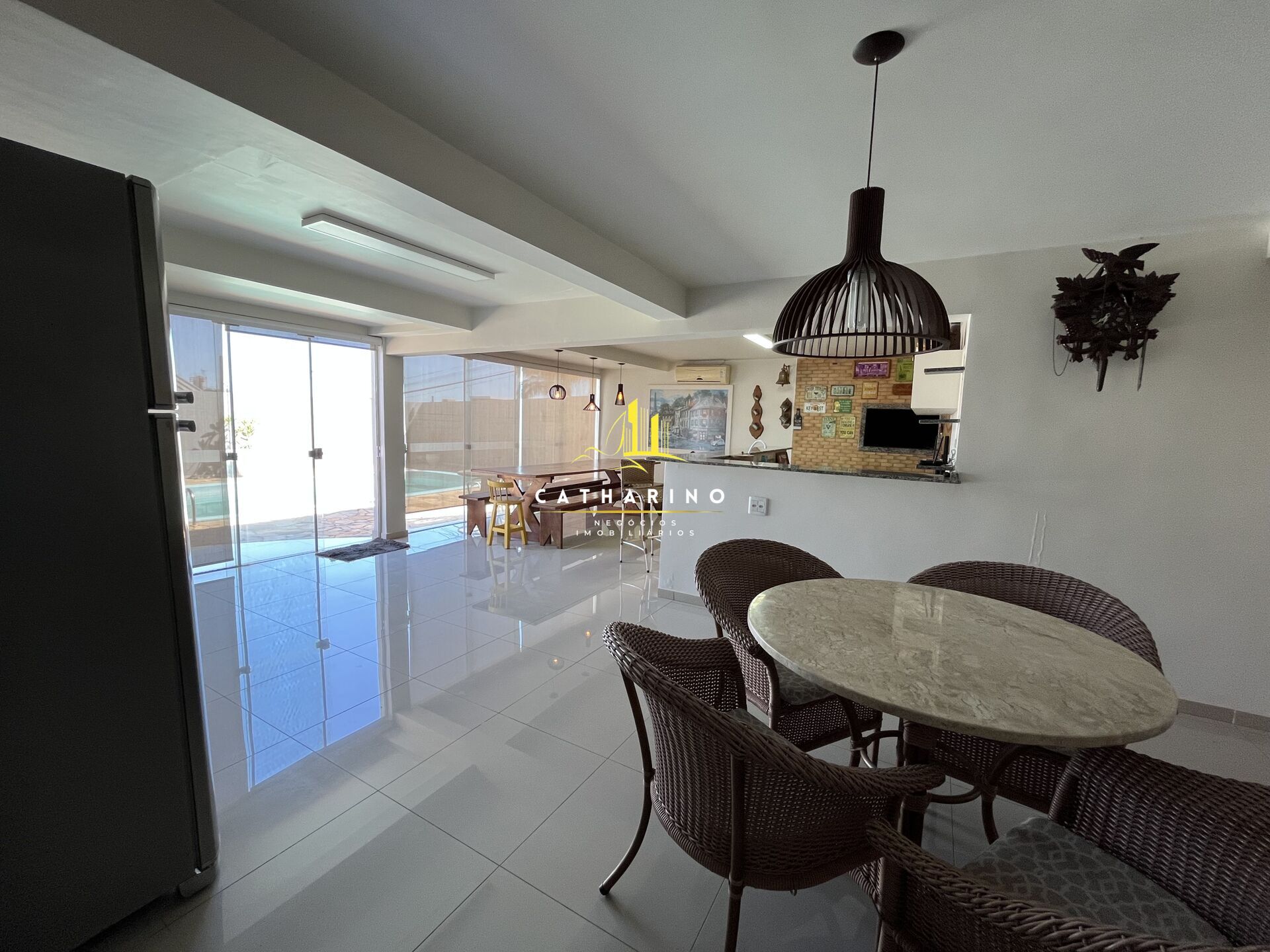 Amplo salão de festas, com lavabo e sala de estar integrados, com acesso à piscina.