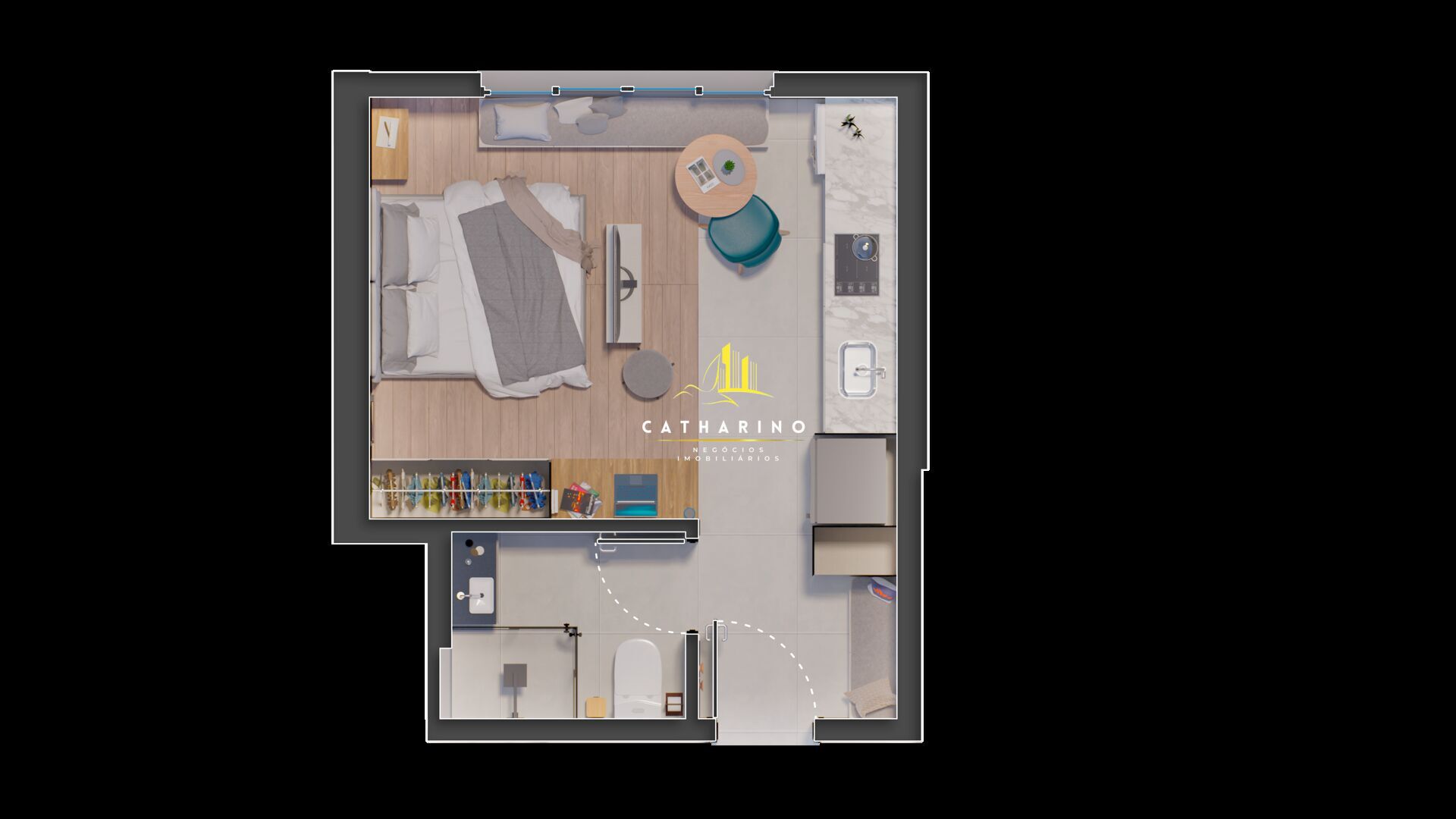 1 Dormitório, sendo 1 suíte1 Banheiro1 Copa1 Cozinha